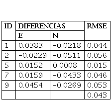 De esta tabla se puede apreciar que, de los 5 puntos, 3 presentan un error cuadrático medio inferior a 5 centímetros. Y, en promedio, un total de 4.3 centímetros. Se debe considerar errores inferiores a 5 centímetros según dicta el Instituto Geográfico Militar en su protocolo de fiscalización, una red geodésica para ser aprobada el RMSE deberá ser menor que esta cantidad. Esto se puede apreciar de mejor manera en la Figura 2.