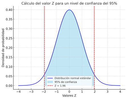 Para una tasa de confianza al 95% a dos colas prueba bilateral, es 0,475. Este valor corresponde a un Z de 1,96 para las regiones de aceptación y rechazo en la cruva de distribución, que equivale al 2,5%. Simbología para el cálculo del Test Z: