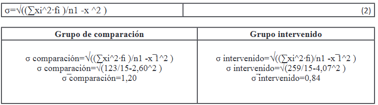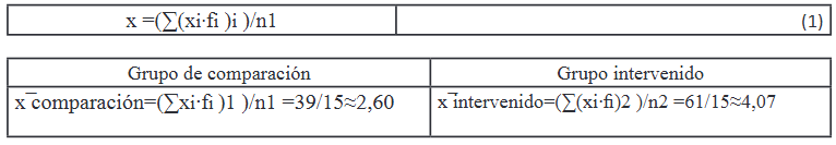 En la Tabla 1 se indican las puntuaciones obtenidas del grupo de comparación tras la evaluación 1. Las calificaciones se distribuyen en una escala de 0 a 5, con las frecuencias correspondientes a cada calificación. Los datos muestran que ninguna calificación de 0 fue registrada, mientras que las calificaciones de 1 y 2 fueron las más frecuentes, con 3 y 5 discentes respectivamente. Las calificaciones de 3 y 4 también presentaron frecuencias iguales de 3 discentes cada una, y solo 1 estudiante tiene la calificación máxima de 5. Estos resultados ofrecen una visión clara del rendimiento del grupo de comparación, evidenciando una concentración en las calificaciones Promedio aritméticos bajas, lo que sugiere áreas de oportunidad para la mejora en las habilidades evaluadas.