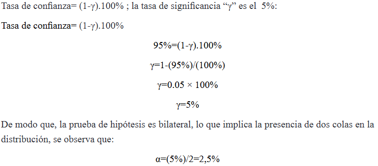 De modo que, la prueba de hipótesis es bilateral, lo que implica la presencia de dos colas en la distribución, se observa que: