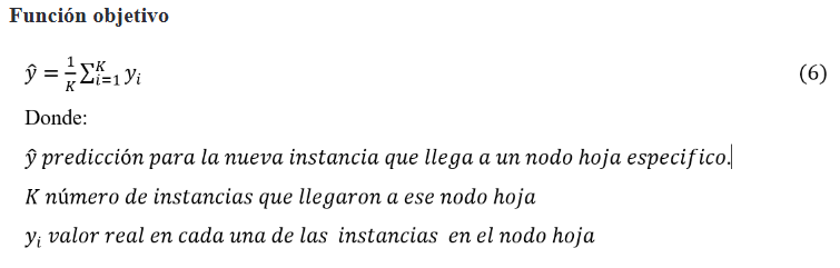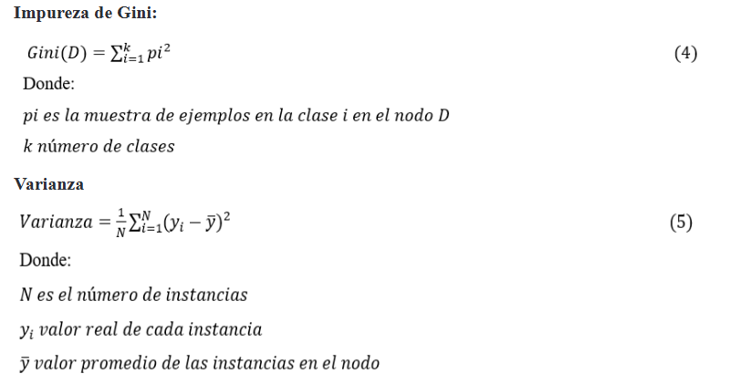 El modelo de árbol de decisiones utiliza criterios específicos de división para evaluar la calidad de las separaciones en los conjuntos de datos, como se indica en (Wang et al., 2012). Las ecuaciones 4, 5 y 6 ilustran estas reglas matemáticas, que son cruciales para la construcción efectiva del modelo. Estos criterios permiten al modelo segmentar los datos de manera que cada división mejore la precisión de las predicciones al crear subconjuntos más homogéneos, fundamentales para la operatividad y eficacia del árbol de decisiones.