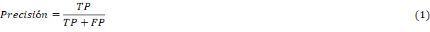 La métrica conocida como precisión se calcula como la proporción de verdaderos positivos en relación al total de predicciones positivas, tal como se señala en (James et al., 2017). Esto significa que la precisión indica cuántas de las instancias que el modelo clasificó como positivas son efectivamente positivas, tal como se fórmula en la ecuación 1. Es crucial considerar que una precisión muy alta podría sugerir que el modelo está sobreajustado, lo cual implica que, aunque realiza predicciones precisas sobre los datos de entrenamiento, podría no generalizar bien con nuevos datos.