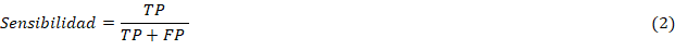 La sensibilidad, o tasa de verdaderos positivos, se define como la proporción de verdaderos positivos dividida por el total de casos positivos reales. Esta métrica, es esencial para evaluar la capacidad del modelo de identificar todas las instancias positivas de manera correcta. Su formulación matemática está detallada en la ecuación 2. Al medir la sensibilidad, podemos comprender cuán efectivo es el modelo al no pasar por alto los verdaderos casos positivos, lo que es particularmente crucial en contextos donde omitir un positivo tiene consecuencias significativas.