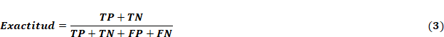 La precisión global del modelo se determina calculando la proporción de predicciones correctas, que incluye tanto los verdaderos positivos como los verdaderos negativos, respecto al total de casos evaluados. Esta medida, se visualiza en la ecuación 3, donde se presenta su formulación matemática. La precisión global es fundamental para valorar la efectividad general del modelo en clasificar correctamente todas las instancias, ya sean positivas o negativas, proporcionando una visión integral de su rendimiento.