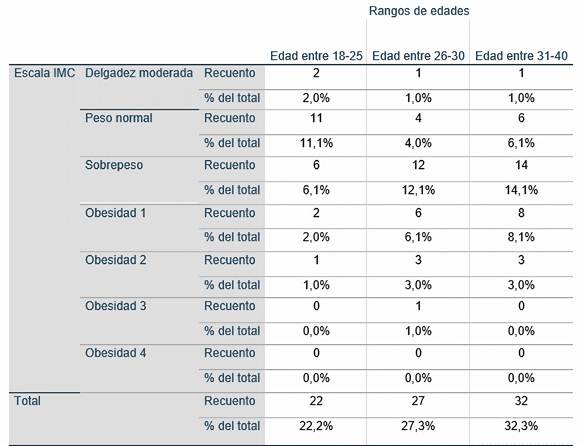 La tabla presenta la distribución de la población en los diferentes rangos de edad (18-25, 26-30, 31-40) según la clasificación del Índice de Masa Corporal (IMC).