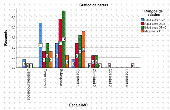 Estos datos se correlacionan con el estudio que realizó Bauce, G. (2021), en donde, se reflejó que los grupos de personas con mayores edades presentan mayor IMC en comparación de personas con edades menores.