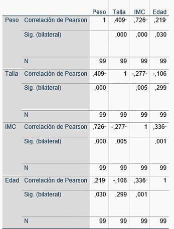 La tabla presenta las correlaciones entre peso, talla, IMC y edad utilizando el coeficiente de correlación de Pearson, que mide la fuerza y dirección de las relaciones lineales entre dos variables. Los valores de Pearson van de -1 a 1, donde 1 indica una correlación positiva perfecta, -1 una correlación negativa perfecta, y 0 indica ausencia de correlación.