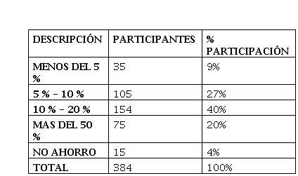 Se estima que el 40 % destina un rango entre el 10 % - 20 % de sus ingresos para ahorrarlos, lo que demuestra solvencia para contrarrestar eventos a futuro. Sin embargo, se debe considerar mejorar su planificación futura para el ahorro.