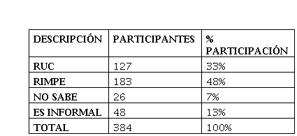 Se conoce que los individuos deben formar parte del catastro o registro de entidades empresariales y del sector cooperativista/comunitario para tener control del Servicio de Rentas Internas y de la Superintendencia de Economía Popular y Solidaria, respectivamente. Por ende, se puede observar que el 13 % es informal, perjudicando el desarrollo económico del sector. Por ello, el plan de formación continua en educacion financiera promueve las buenas prácticas empresariales, siendo una de ellas, ser un contribuyente en cualquiera de sus formas.