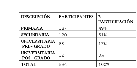 Generar ingresos para sostener una familia o mejorar la calidad de vida se puede reflejar en esta pregunta donde el 49 % de los encuestados posee una educación primaria. Sin embargo, se puede estimar que el 3 % de quienes poseen un título de cuarto nivel se han visto apaleados por la economia del país.
