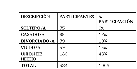 La tendencia del estado civil cuando se tiene un negocio o se es parte de una comunidad, se estima dentro de la UNIÓN DE HECHO, siendo una de las formas legales de para el matrimonio civil, teniendo un 48 % de representantes.