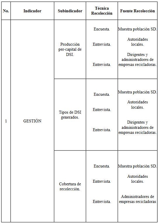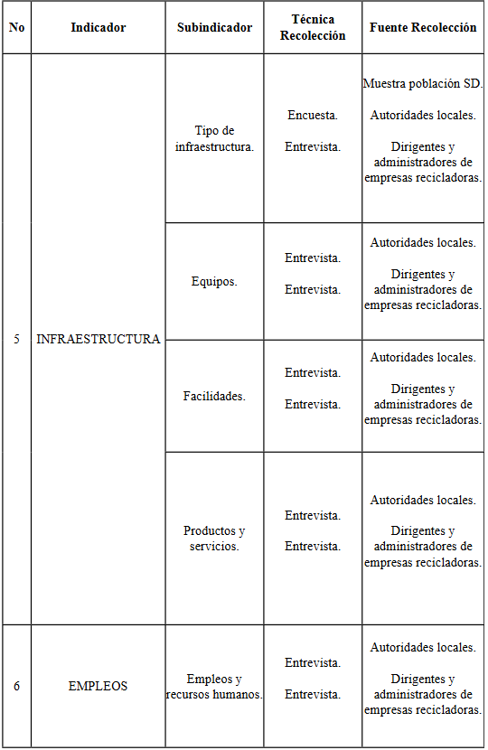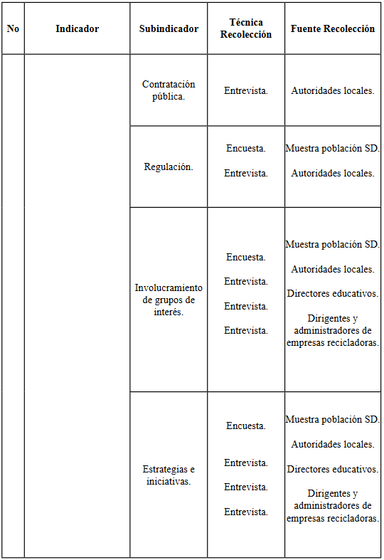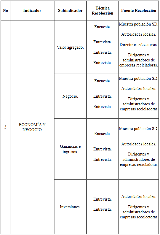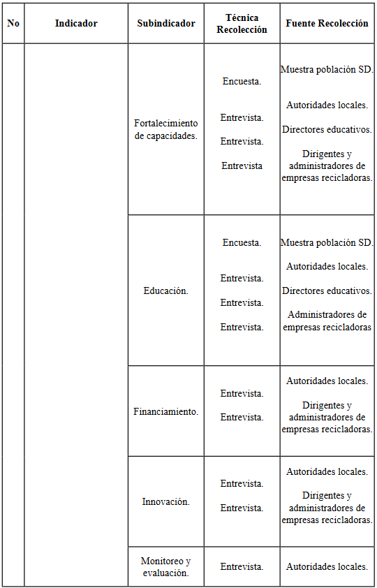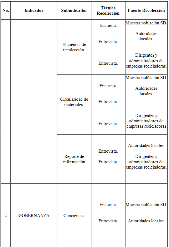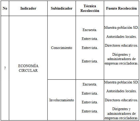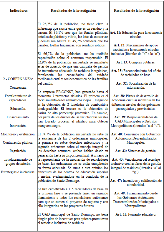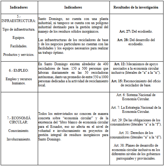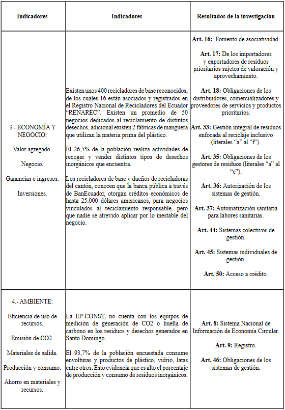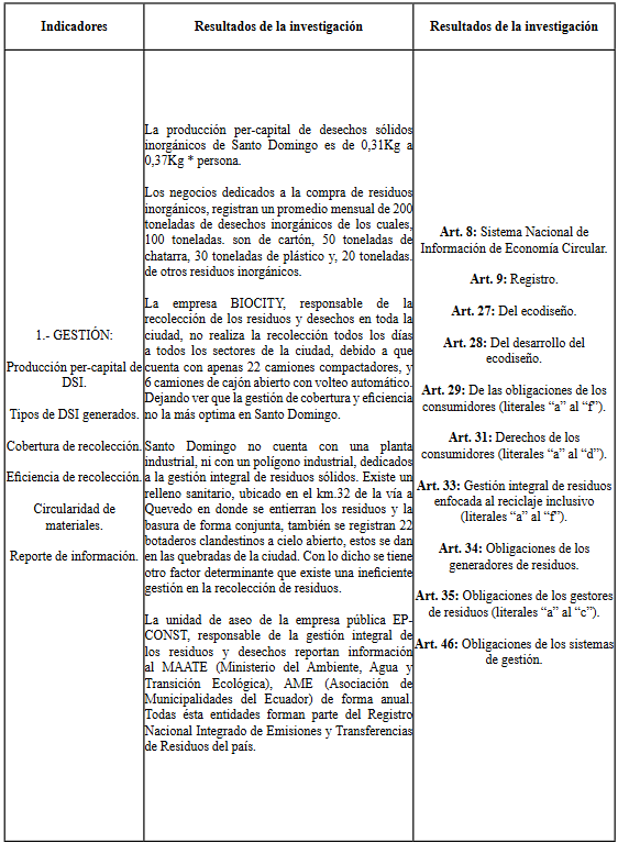 El segundo objetivo específico, hace referencia a la determinación de los 7 indicadores y sus correspondientes subindicadores con los cuales se midió la gestión actual que tiene la ciudad de Santo Domingo, referente al tratamiento que les dan a los residuos sólidos inorgánicos. Los indicadores, fueron determinados en función a la Ley Orgánica de Economía Circular Inclusiva para el Ecuador LOECI, los mismos que miden 7 aspectos esenciales que los residuos sólidos se relacionan, como, la gestión (1), gobernanza (2), economía y negocio (3), ambiente (4), infraestructura (5), empleo (6) y economía circular (7). Todos ellos permitieron conocer el estado en que se encuentran los distintos sectores involucrados con los residuos sólidos.