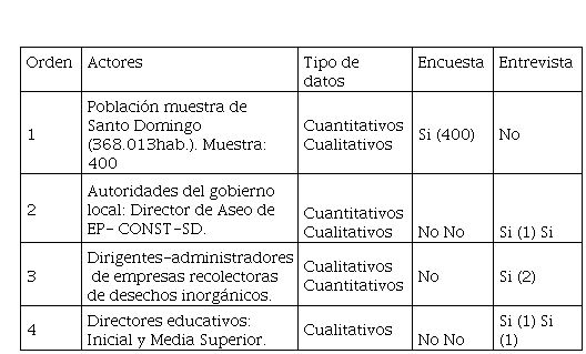 La encuesta se aplicará a la muestra poblacional de Santo domingo, mientras que la entrevista, se aplicará a las autoridades locales, como es el caso del señor alcalde de la ciudad, igualmente al director Municipal de Medio Ambiente, también a los Dirigentes y administradores de las empresas dedicadas a la recolección de desechos inorgánicos. También se aplicará la entrevista a los directores de las instituciones educativas de los niveles medio y superior que se encuentran en Santo Domingo.