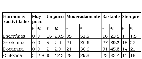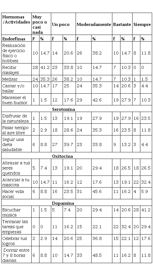 En cuanto a las actividades más frecuentes que inciden en la producción de las hormonas de la felicidad se desataca el nivel moderado en el buen humor (42.6%) y ejercicio físico (38.2%), las cuales, inciden en la producción de endorfinas. De las actividades que produce serotonina, sobresalen con un nivel moderado y alto el disfrutar de la naturaleza (27.9%), pasar tiempo al aire libre (35.3%) y seguir una dieta sana (33.8%). En la producción de oxitocina con un nivel muy alto, incide el contacto con las mascotas (32.4%), seguido por el nivel moderado en la acción de abrazar sus seres queridos (29.4%) y hacer vida social (45.6%). En la producción de dopamina interviene en nivel alto, el escuchar música (41.2%), terminar las tareas que empieza (32.4%) y con un nivel moderado el celebrar los logros (36.8%) y dormir de 7 a 8 horas diarias (48.5%).