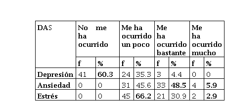 Además, se aplicó la Escala de Depresión, Ansiedad y Estrés DAS de Antony et al., (1998) y validado en Colombia por Ruiz et al., (2017), a cuál, tiene una confiabilidad Alfa de Cronbach de α= 0.81 para depresión, α = 0.79 para estrés, α= 0.76 para ansiedad y de 0.86 global, que de acuerdo con Aiken (2003) es adecuada. El instrumento está conformado por 21 ítems con una escala de respuesta que va desde 0. No me ha ocurrido; 1. Me ha ocurrido un poco, o durante parte del tiempo; 2. Me ha ocurrido bastante, o durante una buena parte del tiempo; 3. Me ha ocurrido mucho, o la mayor parte del tiempo. La interpretación de los resultados indica que mayor puntaje mayor nivel de sintomatología.