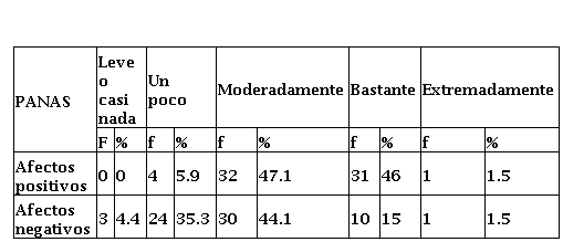 También, se aplicó el test PANNAS para medir los afectos positivos y negativos, el cual, fue validado por García y Arias (2019) en población ecuatoriana. El instrumento consta de 20 ítems, con una escala de respuesta de: 1 levemente, 2 un poco, 3 moderadamente, 4 bastante y 5 extremadamente. La confiabilidad obtenida es de α= .87 para afectos positivos α= .89 para afectos negativos, lo que indica que es adecuada.