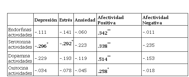 En cuanto al análisis correlacional se observan relaciones positivas leves, pero estadísticamente significativas entre la afectividad positiva y las actividades que producen endorfinas (.342**), serotonina (.338**) y oxitocina (.258*) y de manera moderada con la dopamina (.514**), lo que indica que el descanso, hacer lo que le gusta y el cumplimiento de las metas incide en el estado de ánimo positivo. Además, de identifica una correlación leve pero inversa, de la serotonina con la depresión (-.296*) y el estrés (-.292*), lo que significa que, a menor producción de serotonina, mayor predisposición de sufrir problemas del estado ánimo.