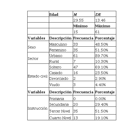 De acuerdo con los datos obtenidos a través de la ficha sociodemográfica, se observa que la edad media (M) de los participantes es de 29.55 años, con una desviación estándar (Ds) de 13.46. En cuanto al sexo predomina el femenino (35%), frente al masculino (33%). Dentro de los datos más significativos se destaca que el 61% reside en la zona urbana, mientras que, el 7 % en sector rural. En relación con el estado civil, predomina el soltero (47%), seguido del casado (16%), el nivel de instrucción que prevalece es tercer nivel (35%), seguido de secundaria (20%). A partir de los datos observados se determina que, de manera general existe variabilidad en cuanto a las características de la población, no obstante, en cuanto al sexo los datos son proporcionales.