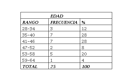Análisis: Del 100% de la población de estudio del Cuerpo de Bomberos del Cantón Gualaceo, se encontró que el 28% poseen entre 35 y 40 años, al igual que se encontró el mismo porcentaje en el rango entre 41 y 46 años; seguido tenemos el grupo de 53 a 58 años de edad, representando un 20%; luego están las edades entre 28 y 34 años representando un 12%; posteriormente las edades entre 47 y 52 años comprenden un 8% y finalmente el 4% corresponden a adultos medios entre 59 a 64 años.