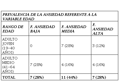 Análisis: Una vez determinado el nivel de ansiedad mediante la prueba IDARE como Estado y la Frecuencia de ansiedad según el tipo de adulto por su rango de edad, se logró evidenciar como datos más relevantes, que existe mayor Ansiedad Media en los adultos jóvenes del personal de cuerpo de bomberos del cantón Gualaceo con un 28%, mientras que en lo que respecta a la frecuencia de Ansiedad Alta, un 16% lo padecen adultos medios. Sin embargo, un 28% de bomberos entre 41 y 64 años, mantienen niveles de ansiedad bajos en su día a día en las diversas actividades que ejecuta.