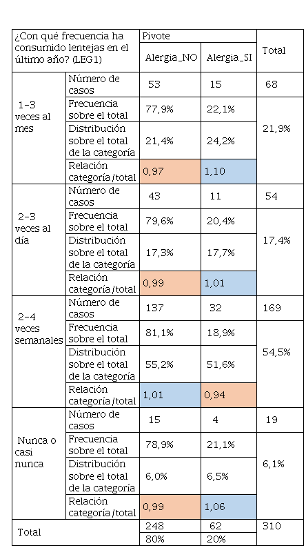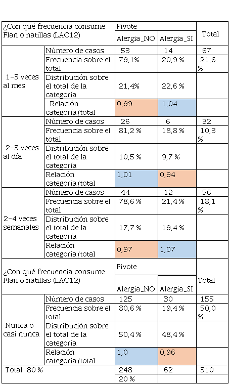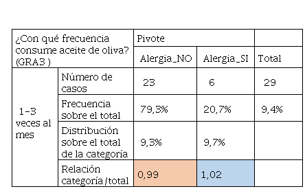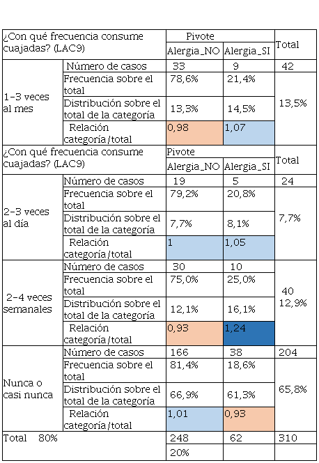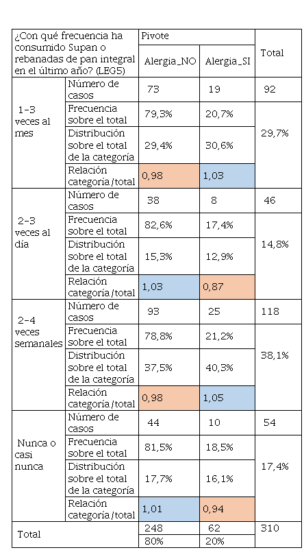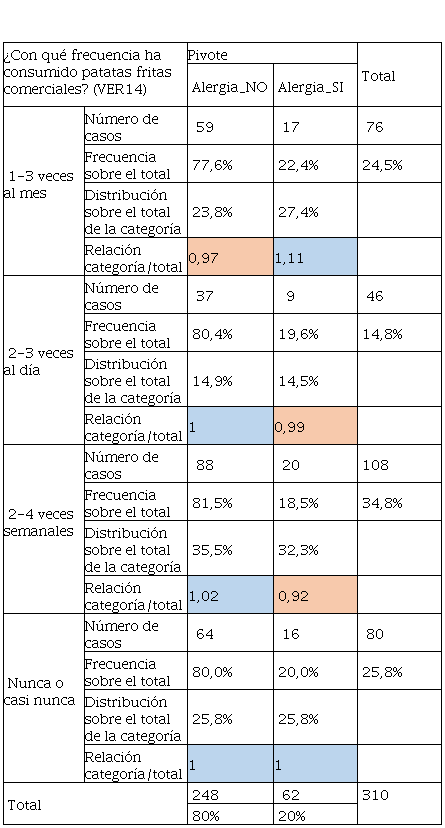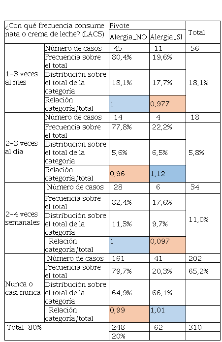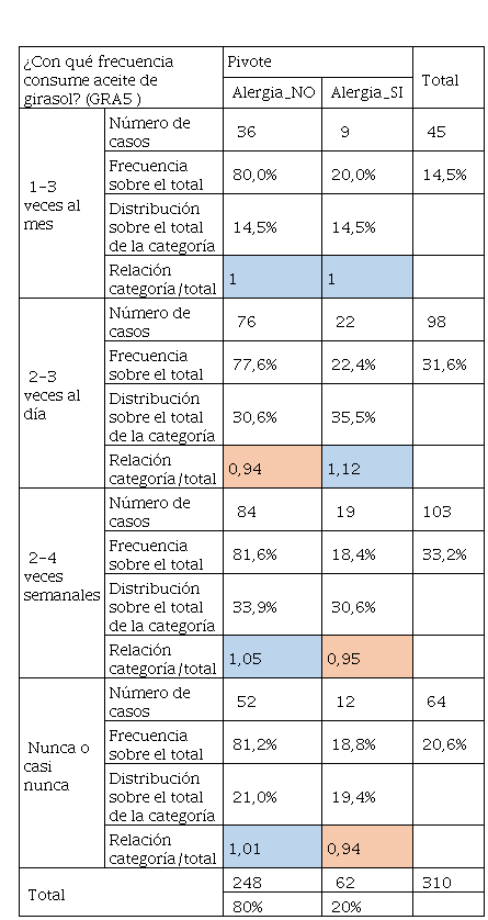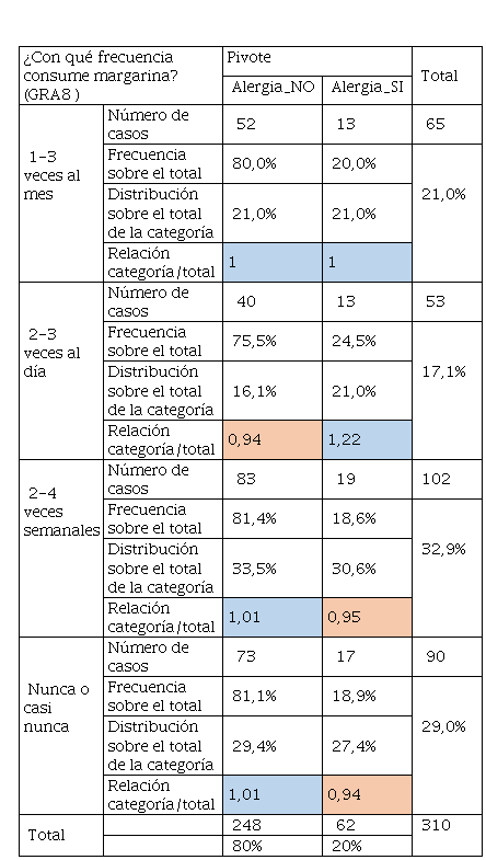 En la Tabla 22 el consumo de aceite de oliva tiene mayor frecuencia y sobre todo es determinante de acuerdo con la relación categoría sobre el total, ya que son superiores a 1 en el alumnado que tuvo alergia. Mientras que los que no tuvieron y según la Tabla 24, se aprecia un consumo pronunciado en personas que no tuvieron alergias, aunque, quienes tuvieron alergias también consumieron este tipo de grasas, pero en menor cantidad frente a los que no tenían. Por otra parte, la Tabla 24 hace referencia al consumo de margarinas que también es un producto que contiene grasa y que no tiene las calidades de la mantequilla, convirtiéndose este producto en “low cost” para llegar a más consumidores. De igual manera, quienes no tuvieron alergias tuvieron un consumo del 54% frente al 21% de quienes tuvieron alergia. El consumo de grasas se vincula al cambio radical del modo de alimentarse, el consumo de alimentos procesados de alta densidad energética, ricos en grasas totales, grasas saturadas, azúcar, sal y un bajo contenido de fibra dietética sigue aumentando de manera significativa. Siendo sus principales factores de riesgo, junto al sedentarismo, sobrepeso y obesidad (Olivares et al., 2008). De ahí que los malos hábitos alimentarios en ocasiones se relacionan con la inclusión de comidas “express” ricas en grasas saturadas y colesterol (Chacón Villalobos, 2021).