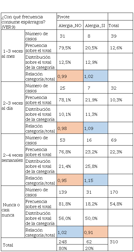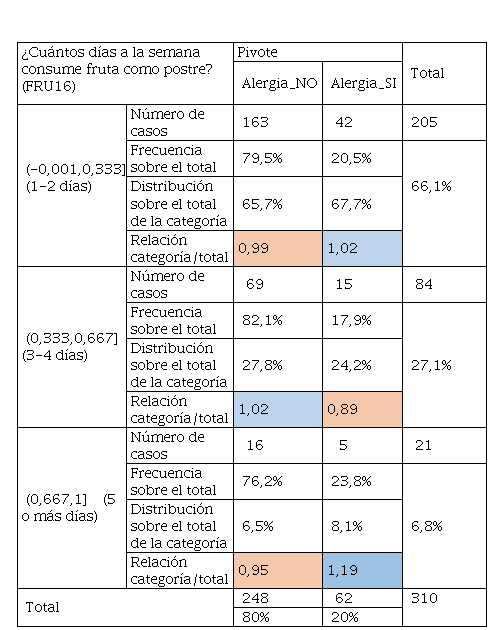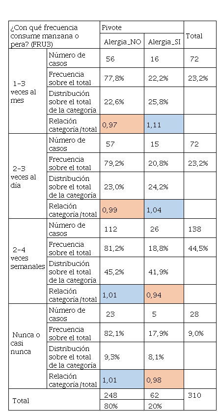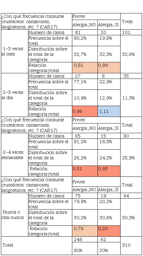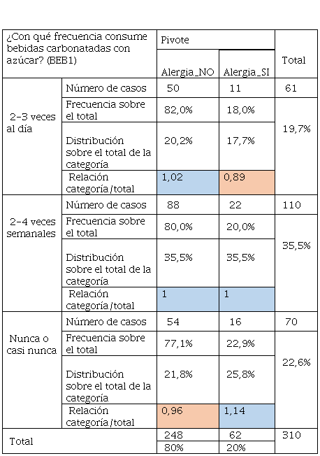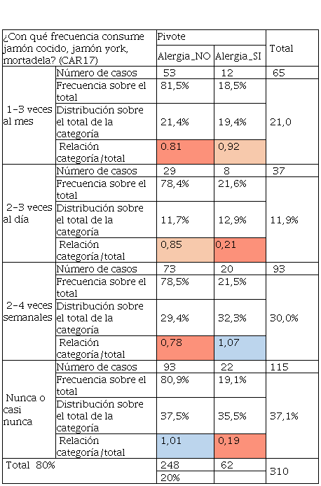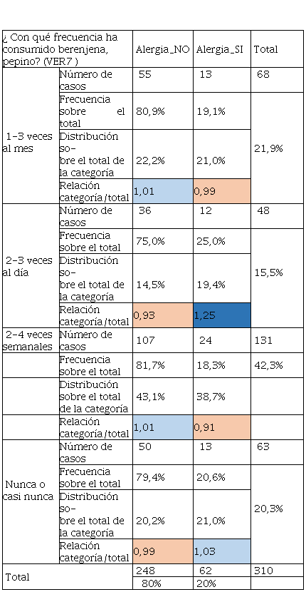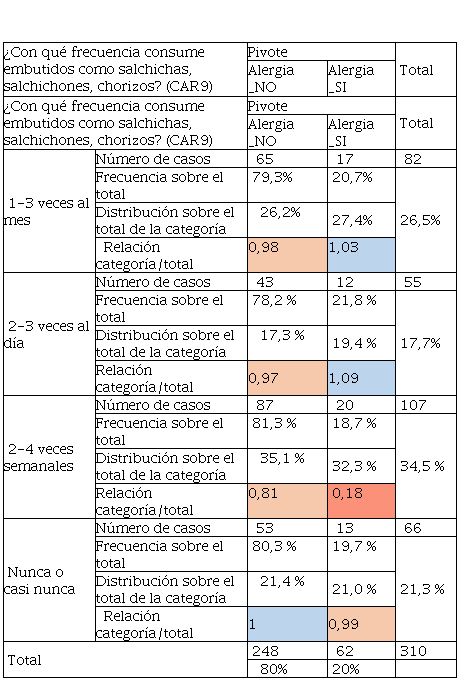 Los resultados presentados en la Tabla 6 sobre el alumnado que presentaba alergia, tiene consumo preferente entre 1- 3 veces al mes o 2-3 veces al día siendo su distribución del 27,4% y 19,4% respectivamente, dado que el indicador de Relación categoría / total es superior a 1, e indica que existe mayor presencia de esta respuesta sobre los resultados, además que los encuestados que no tienen alergia, casi nunca consumen estos productos ya que su distribución fue de 21,4%. Por otro lado, la Tabla 7 relacionada con las respuestas del consumo de mariscos, tuvo un dato de interés y es que los encuestados que tuvieron alergias son los que consumen mayor cantidad de marisco, la relación categoría sobre el total se estableció en 1,11 y represento el 12,9% de su distribución. Así mismo el consumo de productos menos procesados como el jamón york o jamón cocido tuvo una aceptación entre los encuestados que no tuvieron alergia y los que sí, Los que no tienen alergias y con una distribución del 37,5% casi nunca consumieron este tipo de cárnicos, en cambio, con frecuencia de 2-3 veces semanales los que tenían alergias consumieron este tipo de productos, es decir, un 32,3%.