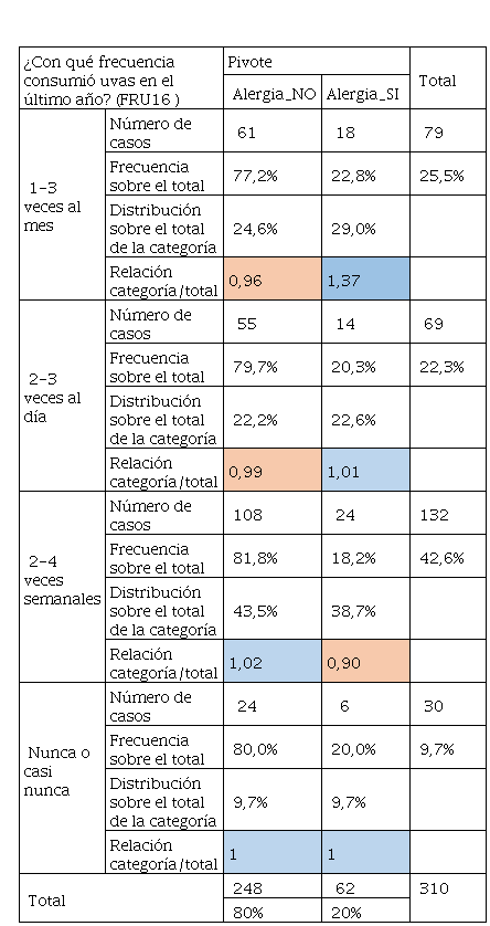 Los encuestados del grupo que poseían alergias son los que mayoritariamente consumen uvas 12%. Predomina si bien es cierto por parte de los encuestados y de manera especial quienes poseen algún tipo de alergia. Todos ellos, han demostrado tener un interés por comer fruta, dado que su valor nutritivo es alto. Así Muñiz-Mendoza et al., (2018) en su trabajo manifiesta que el bajo consumo de frutas y verduras ha sido reconocido como factor de riesgo de las enfermedades cardiovasculares y algunos tipos de cáncer (World Cancer Research Fund/American Institute for Cancer Research, 1997). Las causas que motivan este menor consumo han sido asociadas al cambio en el estilo de alimentación de los chilenos en los últimos 20 años, con un aumento significativo en el consumo de alimentos procesados de alta densidad energética, ricos en grasas totales, grasas saturadas, azúcar, sal y un bajo contenido de fibra dietética, reconocidos entre los principales factores de riesgo, junto al sedentarismo, de la creciente prevalencia de sobrepeso y obesidad observada en el país en los últimos años (Maza-Ávila et al., 2022; Albal, 2002).