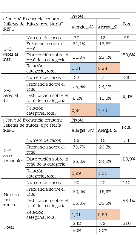 El impacto del consumo de repostería en estudiantes universitarios es un tema complejo que depende de múltiples factores, incluyendo la cantidad y frecuencia de consumo, el contexto de la dieta general, y los aspectos sociales y emocionales asociados. En las tablas 26, 27 y 28 se mantiene un consumo equilibrado por parte del alumnado ya que la relación categoría sobre el total siendo mayor que 1 se distribuye de manera razonable entre el alumnado que tuvo y no alergia. De ahí que, el consumo directo de azúcar se da a lo largo del día, así lo declara el 47.5% de los encuestados. Dicho consumo aumenta en personas que están muy estresadas por exceso de trabajo o en épocas de exámenes, una característica que se agudiza en los hombres quienes consumen hasta un 28% más de alimentos azucarados que las mujeres (Muñoz-Viquillón, et al., 2022). Mientras que el consumo excesivo y descontrolado puede ser perjudicial ocasionando para ello una sobrealimentación (Zuniga-Jara et al., 2018), un consumo moderado y consciente, en un contexto de una dieta equilibrada, puede no tener efectos negativos significativos e incluso podría proporcionar beneficios emocionales (O’LEARYet al., 2012; Peinado et al., 2013; Rosales-Ronquillo & Hernández-Jácquez, 2020).