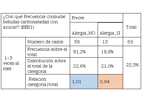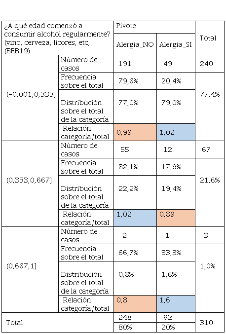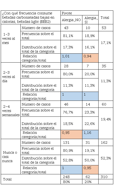 De manera general el consumo de bebidas azucaradas comunes o de baja caloría. La ingesta de alcohol por parte del alumnado con alergia empezó de manera temprana y corresponde a un tercio, es decir, con menos de 18 años este grupo empezó a beber alcohol, mientras que, los otros dos tercios correspondiente a edad superior a 18 años lo hizo de forma moderada o que dejó de tomarlas. Por otra parte, el grupo de los no alérgicos de igual manera tuvo una ingesta de bebidas alcohólicas a temprana edad, luego los dos tercios correspondientes se mantienen con la ingesta de alcohol. Se hace evidente que las edades tempranas de inicio de bebidas alcohólicas no son saludables.