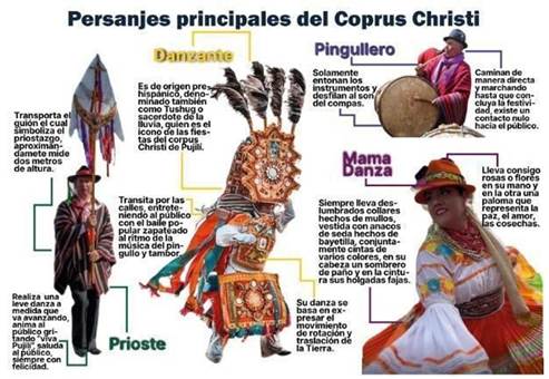 En la descripción de los personajes del Corpus Christi, el danzante, es un personaje destacado dentro de esta festividad, el cual es de origen prehispánico, denominado también como Tushug o sacerdote de la lluvia, quien es el icono de las fiestas del Corpus Christi de Pujilí.