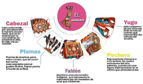 En esta etapa se analizan y observan de manera detallada los principales personajes, el danzante, mama danza, pingullero y prioste basándose en la observación de los accesorios y prendas que portan durante su presentación. Por ejemplo, el personaje el danzante tiene los siguientes accesorios; el cabezal, el yugo, las plumas, el faldón y la pechera (ver figura 3). Se encuentran formas escalonadas que generan una relación con la cruz andina y una concordancia de las plumas con los mundos sagrados.