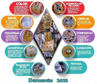 Se analiza los elementos visuales (ver figura 5), como el color, la forma, la textura y todas sus posibilidades en el danzante, la mama danza, el pingullero y el prioste, representados en las infografías.