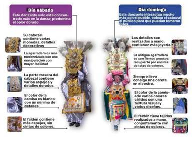 El sábado los personajes tienen una vestimenta más renovada, refiriéndose a los apliques, detalles, bordados, ya que estos son realizados a máquinas, siendo más novedosos, por ende, se va perdiendo el sentido de cultura ancestral que se debería tener siempre presente.