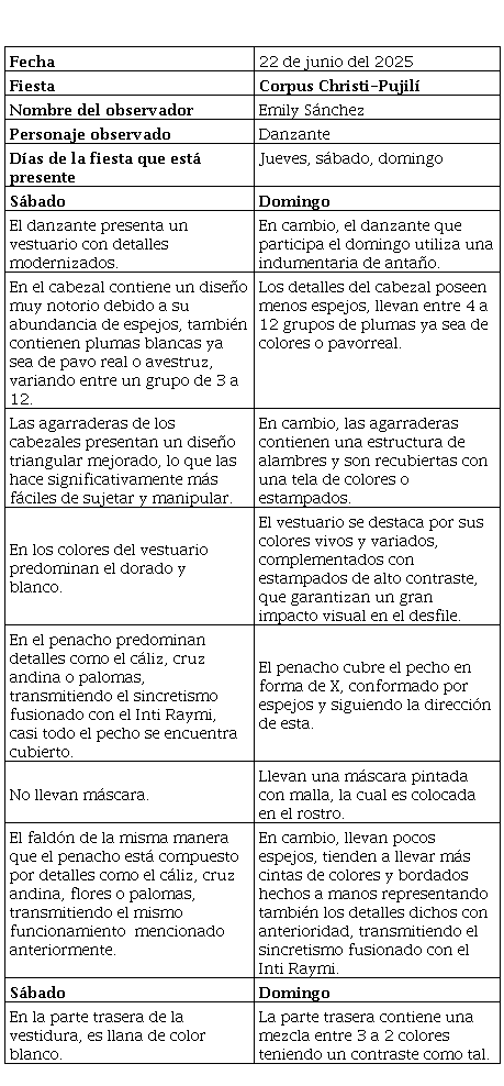 En la investigación se llega a tener una concordancia visual de los dos días de festividad en el Corpus Christi de Pujilí, por medio de una indagación de campo y gracias a las fichas visuales e infografías comparativas, se determina que, la fiesta del sábado es muy diferente a la del domingo ya que los personajes principales del primer día son muy distintos, es posible captar y distinguir a plena vista los detalles, siendo estos muy coloridos, estéticos, emblemáticos, adaptándose a un ritual modernizados y renovado. Cabe recalcar que el público no está tan presente el domingo como se observó en el día sábado.