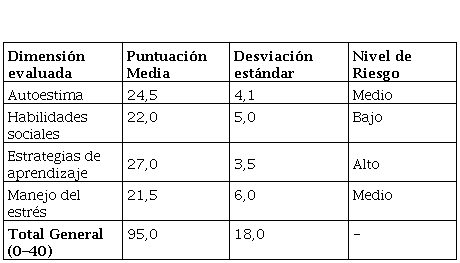 La tabla presentada a continuación muestra una evaluación de factores psicosociales en contextos educativos, donde se detallan cuatro dimensiones clave: autoestima, habilidades sociales, estrategias de aprendizaje y manejo del estrés, cada una de estas dimensiones es evaluada a través de su puntuación media y desviación estándar, lo que permite conocer el nivel de riesgo asociado con cada factor, la información se clasifica en diferentes niveles de riesgo (bajo, medio, alto), brindando una visión integral sobre el estado psicosocial en el entorno educativo, lo cual puede ser útil para diseñar estrategias de intervención y mejora.