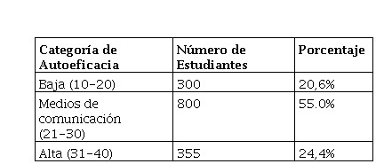 En la siguiente tabla se presenta la escala de autoeficacia, la cual categoriza a los estudiantes en función de su nivel de autoeficacia, según un rango de puntuación las categorías son: baja (1020), medios de comunicación (21-30), y alta (31-40), cada categoría se muestra con el número de estudiantes que se encuentran en ella, así como el porcentaje que representan respecto al total. Este análisis proporciona una visión clara de la distribución de los estudiantes según su percepción de autoeficacia.