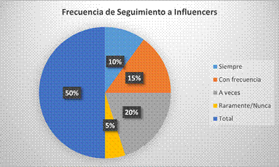 Frecuencia de Seguimiento de Influencers (Figura 1): Hubo una proporción sustancial de encuestados interesados en el contenido de influencers y el 30% seguía a estos influencers a menudo, mientras que el 20% siempre lo hace.