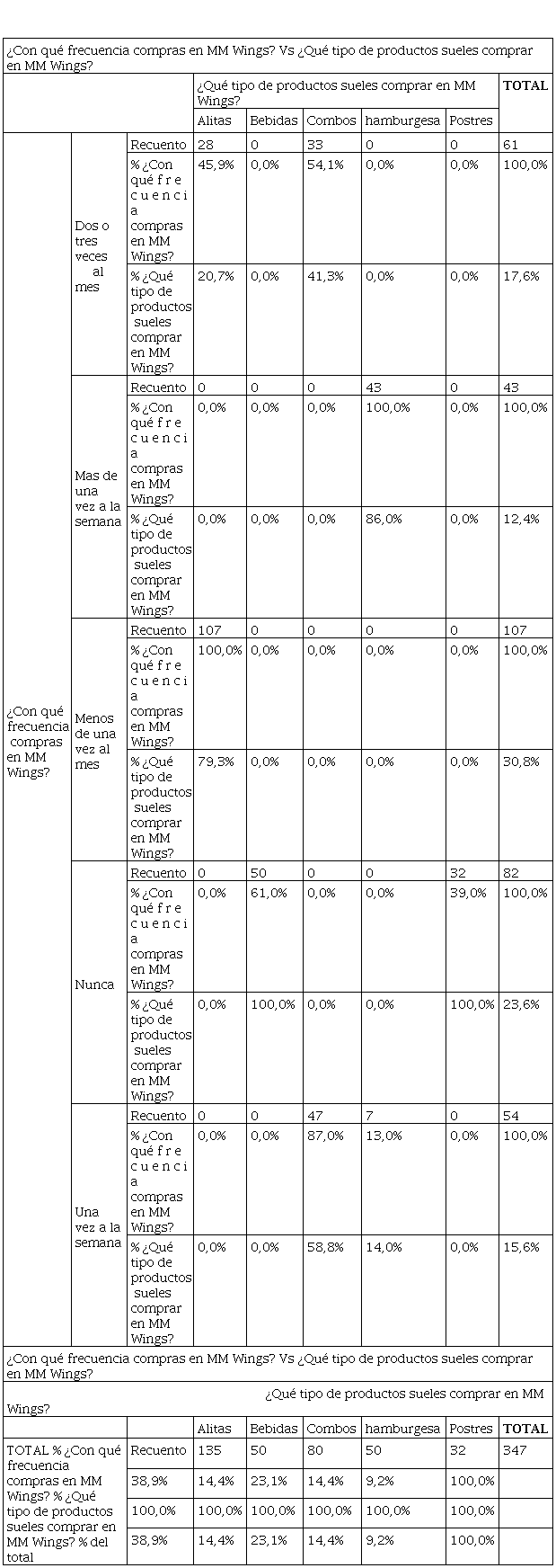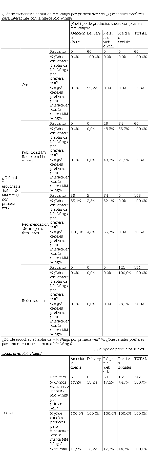 Seguidamente se estructura una encuesta para la recabar el comportamiento del cliente; la misma que esta conformada en tres bloques: percepción de la marca, fidelización cliente y canales de comunicación establecidos en el modelo de Valor de Marca de (Keller, 2020); lo cual permitió obtener respuestas inmediatas y veraces. Para incentivar la participación, los encuestadores se ubicaron en zonas comerciales estratégicas y ofrecieron pequeños incentivos, como descuentos en compras futuras, con el fin de motivar la colaboración de los clientes. Previo a la obtención de resultados se utilizó el software SPSS de IBM para el análisis de las frecuencias y definir las relaciones entre variables, mediante tablas cruzadas; llegando a interpretar dichos resultados y validando a partir de la prueba de chi-cuadrado, demostrando claramente el vínculo o relación que existe entre el consumidor y la marca de MM Wings en la ciudad de Latacunga.