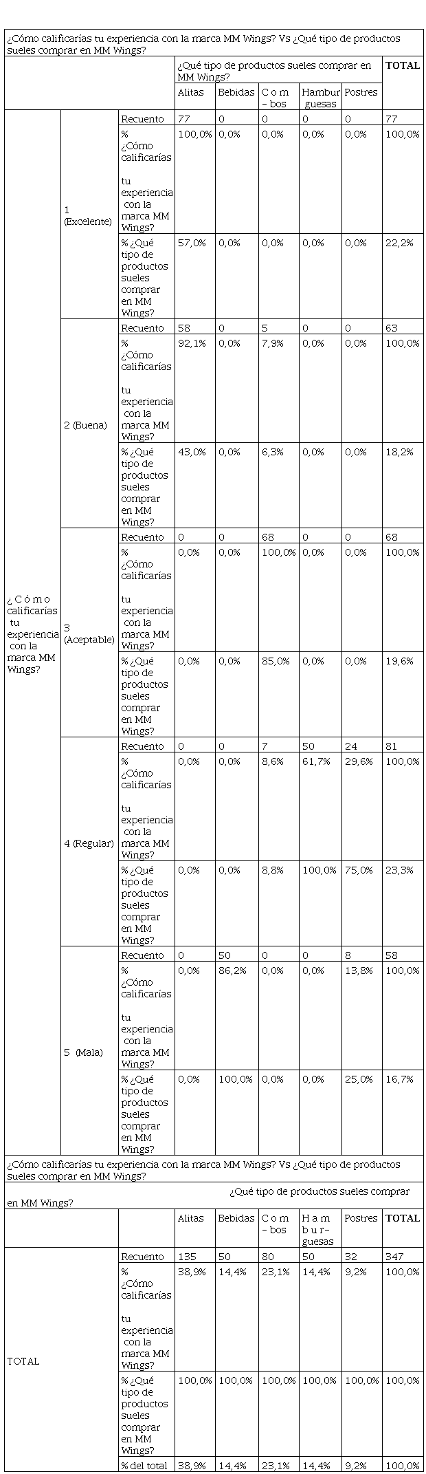 Mientras en la Tabla 6 de experiencia de MM Wings y el tipo de productos comprados detectan modelos significativos en la percepción de la marca. Se observa que su experiencia ha sido evaluada como “excelente” 22.2% comprado exclusivamente, lo que sugiere que los precios de este producto tienen un precio más evaluado con clientes satisfechos. Del mismo modo, existen clientes con “buena” experiencia en 18.2% también es un dominio al comprar alas 92.1%, aunque con pequeñas en combos 7.9%. Por el contrario, aquellos que han evaluado la experiencia como “aceptable” 19. 6% muestran una tendencia clara en combos 100%, lo que podría indicar que este producto no cumple del todo con las expectativas del consumidor.