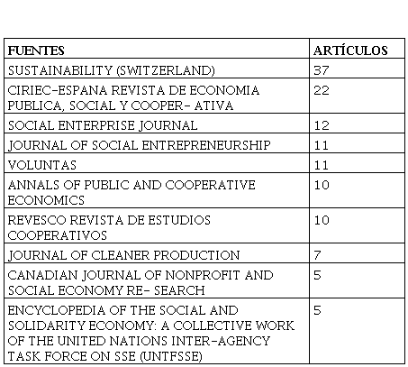 El núcleo de la producción se concentra en las revistas especializadas: Sustainability (Suiza) (37 artículos) y CIRIEC-España. Revista de Economía Pública, Social y Cooperativa (22), Social