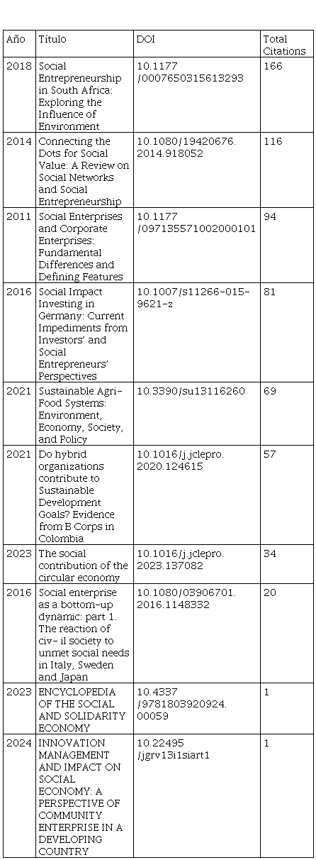 En el análisis Dufays & Huybrechts (2014), se destaca como el segundo más citado (116) después de Littlewood y Holt (2015) (166), siguen siendo piedras angulares en los mecanismos institucionales del emprendimiento social y las posiciones socioeconómicas emergentes de la economía social en relación con los cambios de paradigma económico. En cuanto a las citas por año, los artículos más recientes muestran un dinamismo significativo reciente, lo que indica una relevancia temática actual y una rápida difusión de temas específicos. El incremento en la cantidad de publicaciones en un periodo de cinco años evidencia el interés en las intersecciones entre la innovación social, la economía circular y los temas de la economía social y el emprendimiento social.