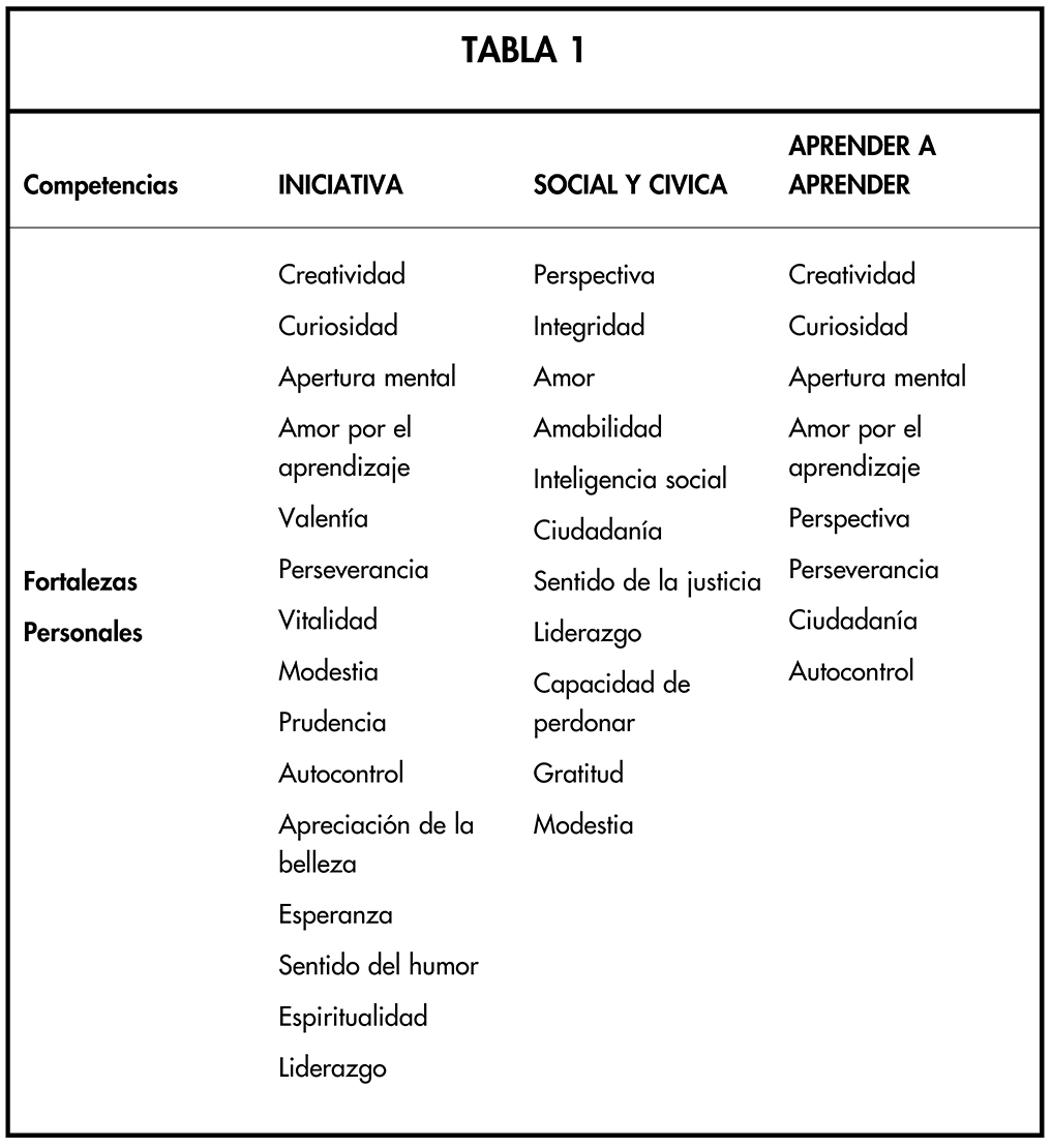 Insertar el modelo de fortalezas de Peterson y Seligman en el currículum aporta un marco integrador, que permite abordar el trabajo escolar en torno a las tres competencias clave de carácter más transversal: sentido de iniciativa y espíritu emprendedor, competencia social y cívica y competencia para aprender a aprender.