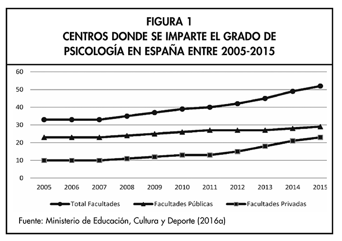Desde el año 2005, se incrementa el número total de centros donde se imparte el Grado de Psicología en España desde 33 hasta 52, lo que supone un incremento del 57% en una década (Figura 1). Este incremento es más acentuado para las centros adscritos a universidades privadas, que pasaron de 10 a 23, lo que supone un crecimiento del 130%. Respecto a los centros adscritos a universidades públicas, el incremento es de 23 en el curso 2005-06 a 29 en el curso 2015-16, lo que supone un crecimiento del 26,08%.