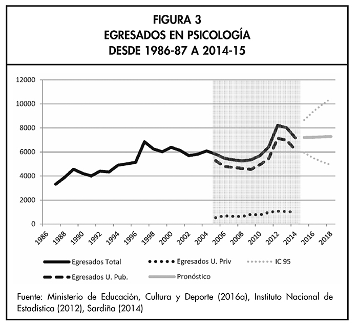 A pesar de la exigencia del EEES, el incremento de la plantilla docente de la última década no ha mejorado ni los indicadores de calidad en la enseñanza (al menos, en la universidad pública) ni los de fracaso académico. De hecho, estudios recientes confirman que el paso de la licenciatura al grado ni mejora ni empeora la formación recibida (Ramiro-Sánchez, Paz Bermúdez y Buela-Casal, 2016), aspectos que cuestionan la eficacia del salto al EEES. El comportamiento de las cifras de egresados, con una tendencia decreciente al inicio de la serie, finaliza la década con tasas de crecimiento superiores al 2%, y próximas al 8% en universidades privadas, instigados por el efecto de extinción del título de licenciado alrededor del curso académico 2011-12. El éxito de este crecimiento ha sido tal que, en el curso 2014-15, más de 1 de cada 4 (27,72%) de los alumnos matriculados en cualquier carrera adscrita a la rama sanitaria eran de Psicología (Ministerio de Educación, Cultura y Deporte, 2016b), una cifra que anuncia limitaciones en la generalización al mercado trabajo. Actualmente, los demandantes de empleo como psicólogos representan más de tres generaciones completas de egresados. Los modelos pronósticos propuestos anticipan el mantenimiento de la tendencia previa: a finales de la década actual, las matriculaciones se situarán por encima de los 75.000 matriculados anuales, con una serie de egresados estabilizada en torno a los 7.500 anuales y de demandantes de empleo estabilizada alrededor de los 21.000 profesionales. Esta propuesta es conservadora si tenemos en cuenta datos obviados como la próxima incorporación de dos nuevos centros privados donde se imparte el Grado de Psicología (Universidad Católica Santa Teresa de Jesús de Ávila y Universidad Europea Miguel de Cervantes) o la aceleración de la tasa de variación anual de la primera matricula en la carrera en 2015-16, que ascendió hasta el 6,74% (Ministerio de Educación, Cultura y Deporte, 2016a). Los modelos mejoraron el ajuste sobre predicciones realizadas en base a medidas promedio, no obstante, el propio comportamiento de las variables modelizadas no permite grandes cifras en parámetros de ajuste de la predicción.