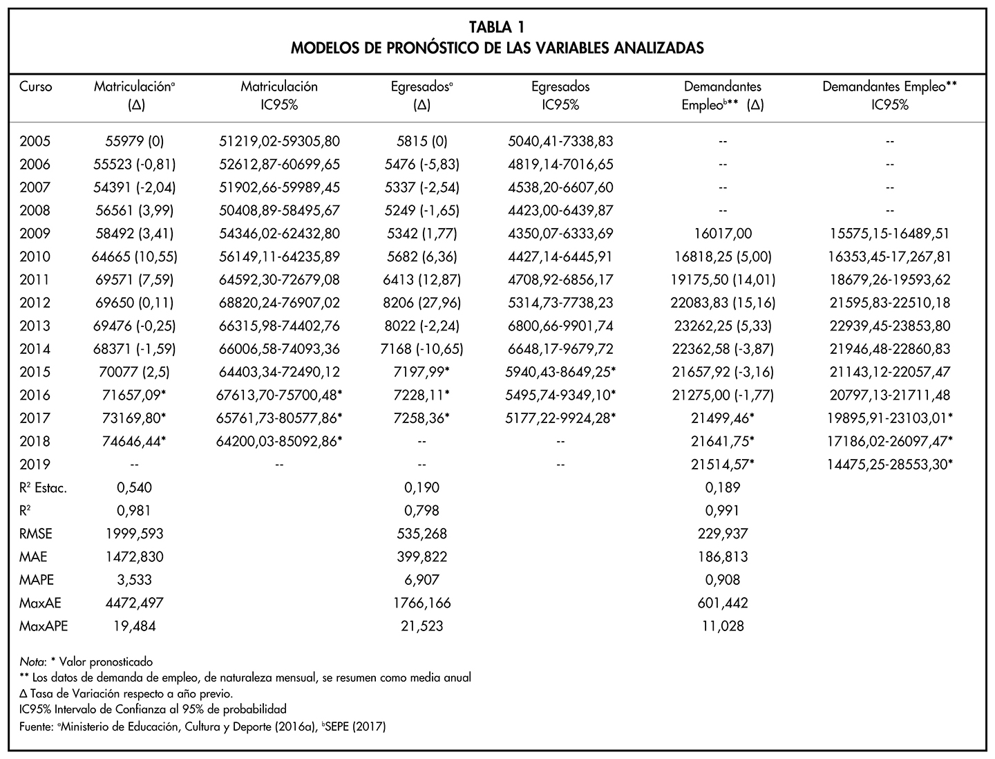 El análisis descriptivo de las series temporales se basa en la tasa de variación de las distintas variables consideradas en los cursos académicos desde 2005-06 hasta 2015-16. La tasa media de variación se calculó a partir de la media geométrica de los valores de las series temporales. El análisis de la tendencia de las series se estima mediante procedimientos de regresión curvilínea y el coeficiente de determinación , éste último para cuantificar la bondad de ajuste de la estimación de la tendencia. Los modelos de predicción para las series temporales se llevaron a cabo para las variables “Matriculados Universitarios en Psicología”, “Egresados en Psicología” y “Demandantes de Empleo como Psicólogo” en el SEPE. Para proponer modelos de pronósticos se utilizan los datos de matriculados disponibles desde el curso académico 1980-81, mientras que en el caso de los egresados se consideran datos desde el curso académico 1987-88 hasta el presente, procedentes de las fuentes arriba señaladas.