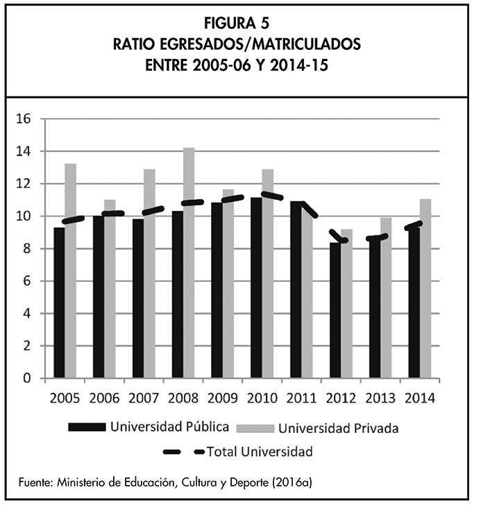 Hasta el curso académico 2014-15, para el Total de Universidades, la diferencia en la ratio de egresados/matriculados en los cursos extremos de la serie es de 0,12, lo cual representa una tasa de variación negativa del -1,24%. La tasa media de variación anual es de -0,83%. En el caso de la Universidad Pública, la ratio es 9,3, exactamente la misma en ambos valores extremos de la serie, con una tasa media de variación anual de -0,01%. Respecto a la Universidad Privada, la ratio egresados/matriculados desciende desde los 13,23 hasta los 11,05, una tasa de variación del 16,45% entre los extremos de la serie; es decir, una tasa media de variación anual del 1,85%. La evolución de la variable en la década analizada se representa en la Figura 5.