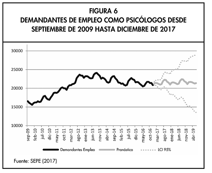 La Figura 6 recoge el número de demandantes de empleo como psicólogo desde septiembre de 2009 hasta el final del año 2016, un total de 88 registros mensuales. Durante este periodo, el promedio de demandantes es de 20.718,83 (DT=2.372,31). La serie parte desde los 16.534 demandantes de empleo y finaliza en los 21.411 de noviembre de 2016, lo cual representa una tasa de variación del 29,49% entre los extremos de la serie, y una tasa media de variación mensual del 0,27%. Respecto al rango la serie, esta encuentra su valor mínimo en diciembre de 2009, con 15.572 demandantes frente al máximo de 24.090 demandantes en septiembre de 2013.