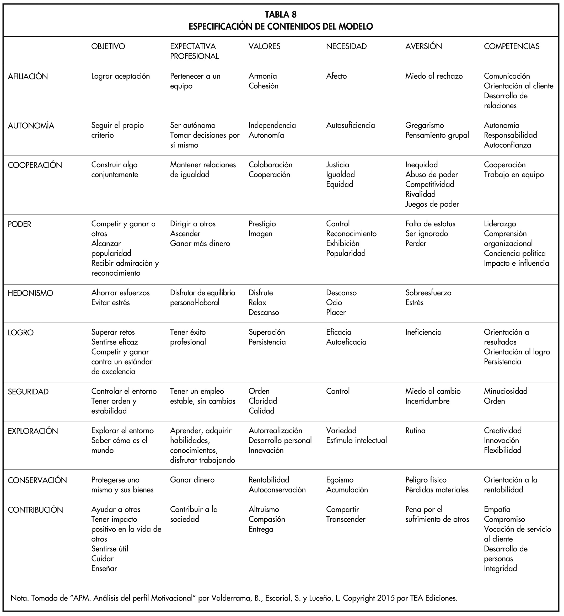 El análisis de la validez de contenido empieza con la definición operacional del dominio. La Tabla 8 muestra la especificación de contenidos elaborada para representar los diferentes constructos derivados del modelo Rueda de Motivos. Se tuvo en cuenta para ello, además de los objetivos, necesidades y valores, los comportamientos laborales que dichos motivos suscitan, etiquetados como competencias, de modo que el modelo fuera directamente aplicable a la selección y desarrollo de talento. También se incluyeron las expectativas profesionales, es decir, los incentivos o recompensas organizacionales a los que son sensibles las personas en función de sus motivos dominantes. De este modo pueden alinearse las políticas de atracción, vinculación y compromiso del talento con los diversos perfiles motivacionales (Tabla 9).