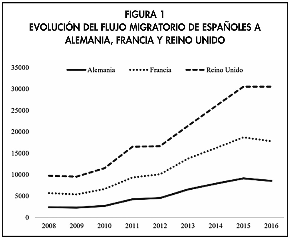 La historia de España como un país de emigración tampoco es nueva, incluso podría decirse que se trata de un hecho endógeno. La emigración adquirió mucha importancia en el desarrollo económico, cultural y social de España en el pasado y vuelve a tener gran relevancia en el presente. Fenómenos y momentos concretos del siglo XX han marcado recientemente nuestra historia como país emigrante. Ejemplo de ellos pueden ser la dictadura franquista, que durante todo su periodo condenó a miles de personas al exilio, o la modernización de la agricultura que provocó durante la década de los sesenta una fuerte emigración hacia países vecinos derivada del excedente de mano de obra surgido a partir del éxodo de las zonas rurales a las urbanas. La crisis económica acontecida en los últimos años a partir de 2008 caracteriza de nuevo al país como emigrante, aunque continúe siendo receptor de flujos migratorios. A pesar de que esta recesión de la economía pueda enmarcarse en una crisis global, hay factores internos como el freno del “boom inmobiliario” que ha supuesto que se sufra de manera más severa que en otros países y con consecuencias de gran calado. Las cifras sobre las personas que se han desplazado en este último tiempo no están claras, pues existe una discrepancia entre los datos ofrecidos por las instituciones españolas y los aportados por otros países. Estas diferencias, que ya fueron señaladas por González-Ferrer en 2013, continúan en la actualidad. A modo de ejemplo, podemos citar los casos paradigmáticos de Reino Unido e Irlanda. Para el primero, según el INE (2016) el número de españoles emigrados en 2015 era de 6.038 mientras que los organismos británicos ofrecían una cifra de 50.028 (cinco veces más). En el segundo caso las diferencias se multiplican por ocho, 516 personas según el INE y 4351 según las instituciones irlandesas. Actualmente el INE (2017) señala que el número total de personas españolas que han emigrado desde 2008 al extranjero es de 556.918, de las cuales un 42% viven en países europeos. Entre los principales destinos se encuentran Reino Unido, Alemania y Francia. Los flujos migratorios han ido incrementándose año a año, aunque se vislumbra una tendencia a la baja a partir de 2016. A continuación, se muestra un gráfico que recoge la evolución desde el año 2008 hacia éstos tres destinos principales