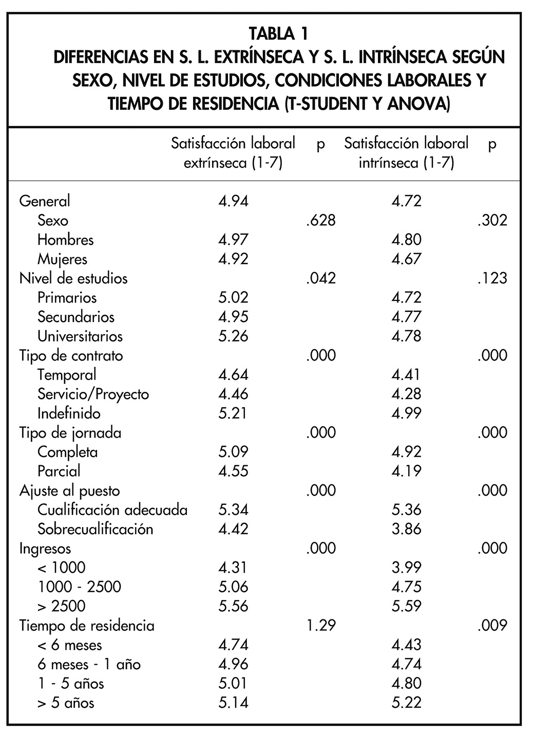 Los resultados muestran mayores niveles de satisfacción (extrínseca e intrínseca) para aquellas personas que tienen un contrato indefinido, a tiempo completo, con mayores ingresos y ajustado a su nivel formativo. Por otro lado, obtenemos una mayor satisfacción laboral extrínseca en personas con estudios universitarios respecto a aquellas de estudios primarios o secundarios. Por su parte, para la satisfacción laboral intrínseca también son importantes cuestiones como el tipo de tareas, en el sentido de que éstas sean estimulantes y no repetitivas o aburridas, no percibir un control estricto por parte de los superiores o no tener un horario muy extenso. En cualquier caso, los resultados ponen de manifiesto que las condiciones laborales determinan ambos tipos de satisfacción (Tabla 1).
